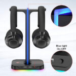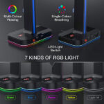 - 【RGB Lighting Base】This headphone holder features 7 kinds of lighting modes, specialy the multi-color flowing and single-color breathing mode, creat a fantastic gaming atmosphere. One button for easily selecting light mode and turn off.
