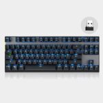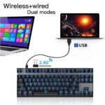 • 【WIred and Wireless】【MECHANICAL GAMING KEYBOARD】【HIGH QUALITY AND RELIABLE PERFORMANCE】【87 RESPONSIVE KEYS】【STRONG COMPATIBILITY】Brown Switches / blue backlit lights eless】Equipped with ultra-fast 2.4G wireless transmission technology, this keyboard is more stable and reliable, the transmission distance is up to 10 meters(approx 30ft). Also, comes with a detachable USB cable, you can easily charge the keyboard as well as shifting to wired mode per your needs