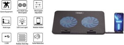 Size: 418*286*28 mm DC: 5V 6LEVELS LED Light 2USB ports Rated power: 3.7W±10% Rated current : 120 MA Function Product size: 418*286*28 mm Height adjustment: 6 LEVELS Light: With blue Led of fans USB: 2 USB ports Rated power: 3.7W±10% Rated current : 120 MA DC: 5V Fan properties Fan size: 70*70*15(6 PCS) Fan speed:2400+/-10 % RPM Control: With rolling speeder Material: ABS+ Iron Mesh Suitable for below 17″